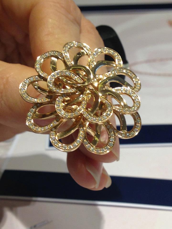 - En este anillo de oro rosa con diamantes, nos muestra la técnica de la joya. Una gran construcción requiere de una técnica que permita diferentes niveles, formas, dimensiones, engarzados, lo que no nota la mujer pero que le hace ver algo espectacular en la pieza.