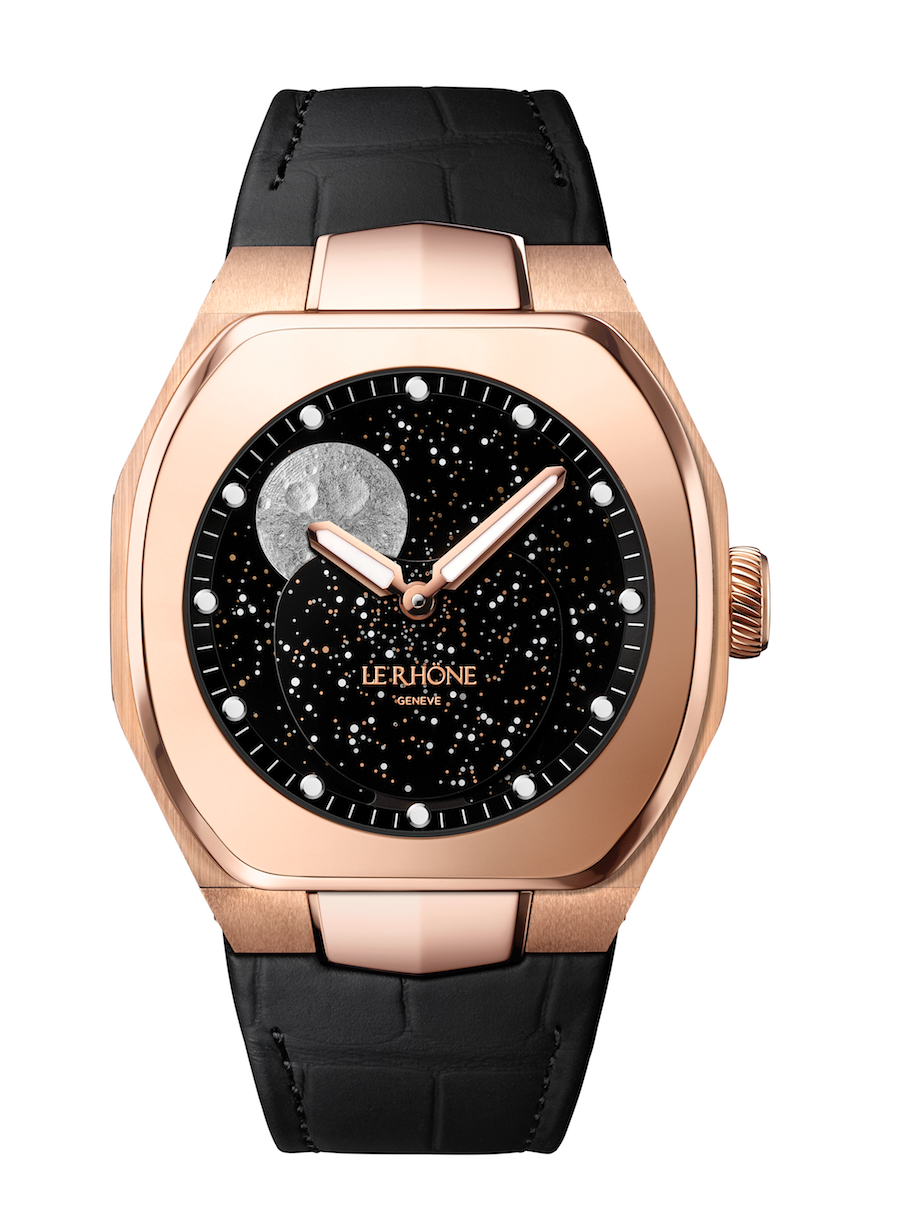 Moön Black Cosmic añade una complicación de fase lunar que contrasta con la cósmica carátula en color negro. El disco en el que se muestra la parte superior de la luna está elaborado en plata texturizada, mientras que el cielo con estrellas están hechas de luminova.