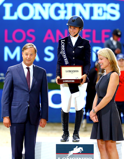 Embajador de la Elegancia Longines Jane Richard, ganador de Longines Speed Challenge del viernes, y Jos Verlooy, ganador del Gran Premio Longines el domingo, recibieron wathes elegantes Longines de las manos de la señora Jennifer Judkins, Gerente de Marca Longines EE.UU., y el Sr. Charles Villoz , Vice Presidente de Longines, por sus increíbles actuaciones.