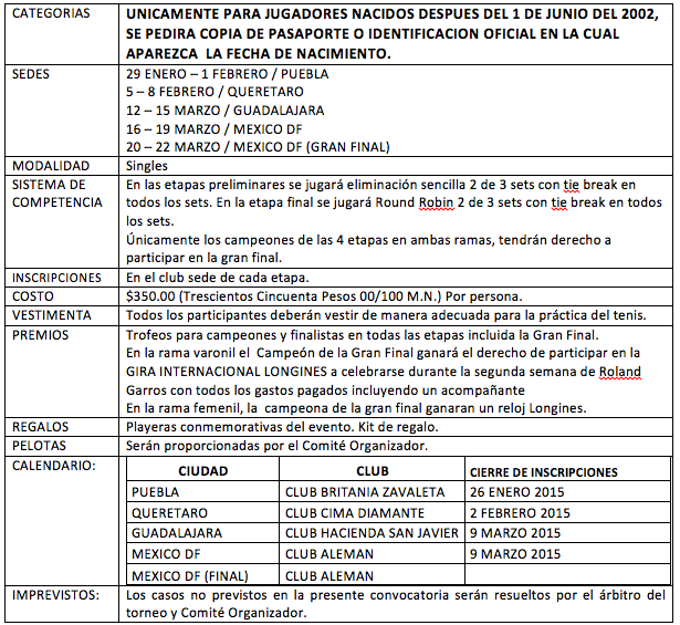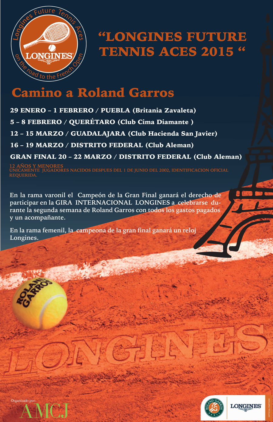 El Torneo Longines Future Tennis Aces 2015 se compone de 4 etapas y una Gran Final en diferentes ciudades de la República Mexicana, teniendo como premio principal para la rama VARONIL el participar en la final internacional a celebrarse en Paris, Francia, durante el torneo de Roland Garros 2015 y para la rama Femenil, se hará acreedora a un Reloj Longines.