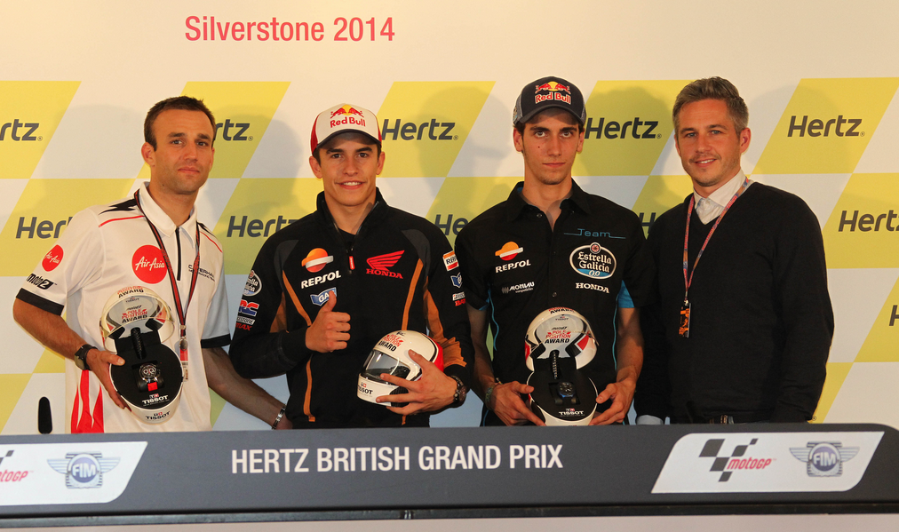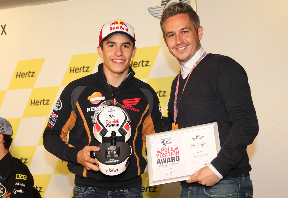 De este adjetivo debemos apuntar que Marc ha conseguido su décima posición de privilegio, y con ello su décimo reloj Tissot. El actual Campeón Mundial se vistió de gloria en el asfalto de Silverstone y corrió desde la pole gracias a su manejo de precisión y velocidad, cualidades coincidentes con una pieza de relojería hecha en Le Locle, asimismo, Marc fue condecorado con un Tissot T-Touch Expert Solar, entregado por el presentador de televisión Matt Roberts.
