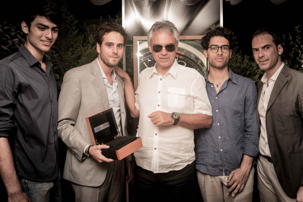 - Alessio Ambrosini (Officine Panerai Italia), Veronica Bocelli (esposa de Andrea Bocelli), Andrea Bocelli, Amos Bocelli (el hijo de Andrea Bocelli) y Giacomo Cinelli (Officine Panerai Italia).