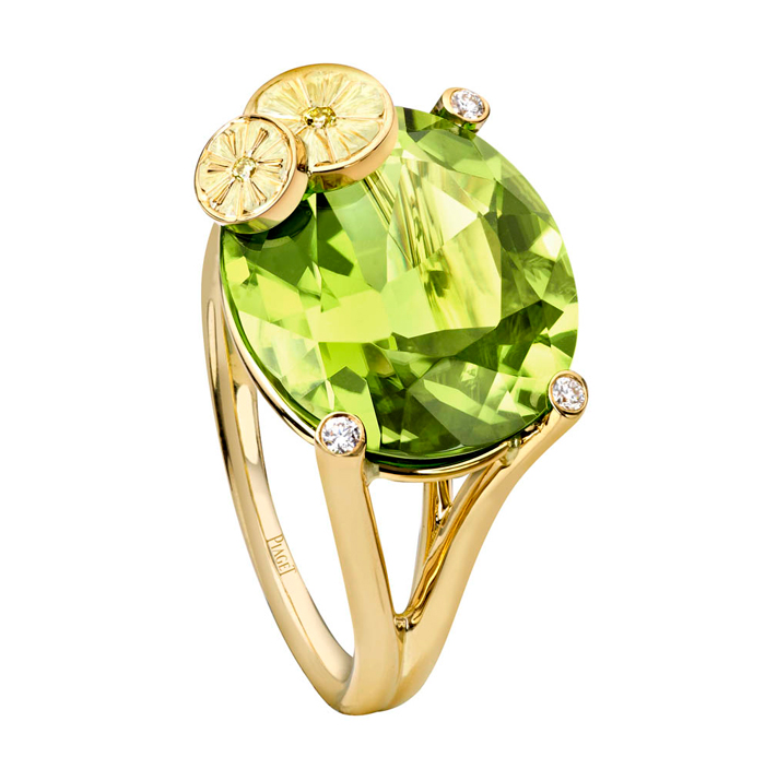 - Tutti Green Cocktail Inspiration: anillo de oro amarillo de 18K con 1 periodot forma ovalada (aprox. 10,98 quilates), 3 diamantes talla brillante (aprox. 0,04 ct) y 2 diamantes amarillos talla brillante (aprox. 0,02 ct). Ref.. G34H1200
