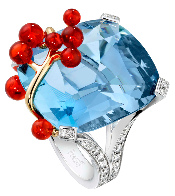 - Blue Sea Inspiration Cocktail: anillo de oro blanco de 18 quilates y oro amarillo montado con una aquamarina talla cojín (aprox. 28,03 quilates), 13 “granos” ópalo de fuego (aprox. 3,18 quilates) y 58 diamantes talla brillante (1,36 ct). Ref.. G34LR500