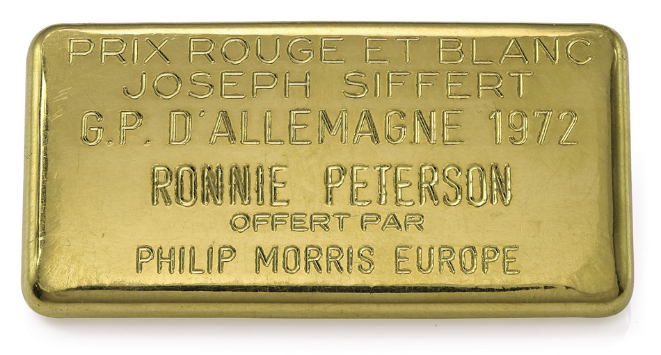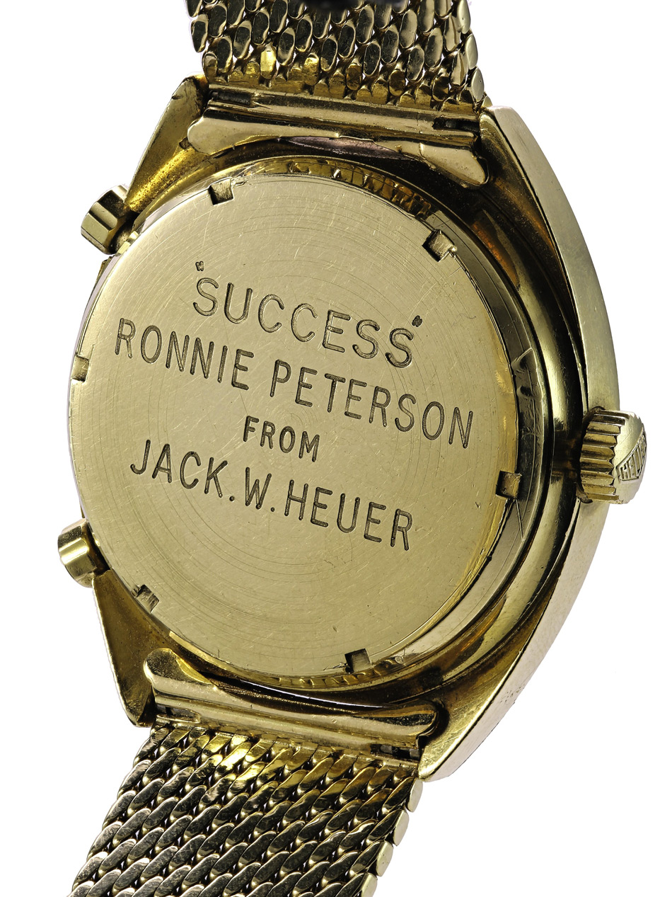 Esta pieza fue un regalo que Jack Heuer hizo a Peterson en 1972, la referencia 1158 se caracteriza por haber sido apodado “el reloj de los pilotos”. Siguiendo con el detalle, el lote incluye un lingote de oro sólido que Joseph Siffert le dedicó a Ronnie debido a su gran desempeño en la carrera de Nürburgring de 1972, mientras que el fondo de la caja lee: “Success Ronnie Peterson from Jack W. Heuer”.