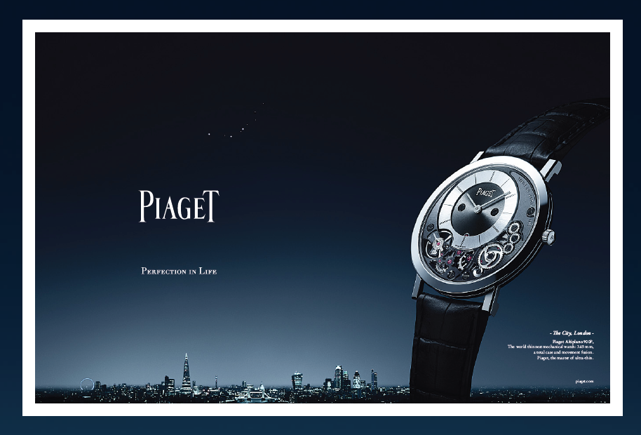 Creada por BETC Luxe, la campaña demuestra el savoir-faire joyero-relojero de Piaget y su búsqueda de la perfección en el que se incluye el dominio de los materiales preciosos, la sofisticación, la innovación y la audaz creatividad combinada con la elegancia tradicional.
