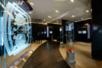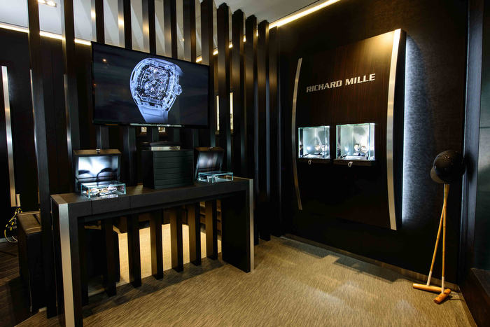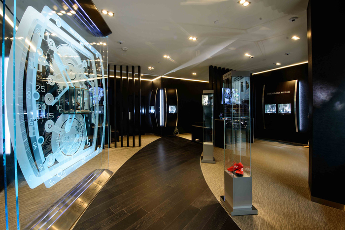 Al entrar en la tienda, los clientes se encuentran con una escultura de dos metros de altura, basada en el movimiento mecánico Richard Mille. La decoración de todo el espacio va en línea con la identidad cálida y funcional del diseño Richard Mille ya que incorpora materiales contemporáneos tales como madera Makassar, acero, piedra y cristal. La escultura de cristal tallado en forma del reloj más emblemático del relojero llama la atención al centro de la tienda, mientras que las vitrinas de vidrio antireflejante de alta tecnología proporcionan el alojamiento ideal a cada reloj en exhibición.