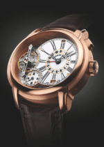 Hoy por la tarde pudimos admirar la indicación de un GMT en color negro, lo cual no solamente es un cambio estético, sino una nueva cara al de por sí bello guardatiempo tridimensional. Asimismo, la pieza de entrada en la colección se develó un Tourbillon de 24 segundos con puentes curvos y una estética mucho más sobria. No obstante los acabados son tan hermosos que la pieza ronda los 290 mil francos suizos. Así pues, el GMT en DLC y el GMT con la platina PVD oro rosa destacan por estética y mecánica en resonancia, pero la séptima gran creación de Greubel es sin duda el QP a Equation, que se inspira en los autómatas del siglo XVII y XVIII para realizar una computadora mecánica que identifique la diferencia entre el tiempo legal y el tiempo Solar.