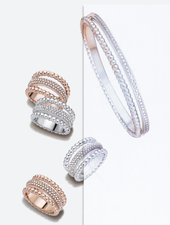 Para Swarovski más es más, es decir, mientras más piezas se combinen ¡mejor! Y la colección está dispuesta para ello: diseños con piedras sobrepuestas (stone stacking) y piezas delgadas y gruesas que ofrecen la posibilidad de lograr el layering que está totalmente en tendencia.