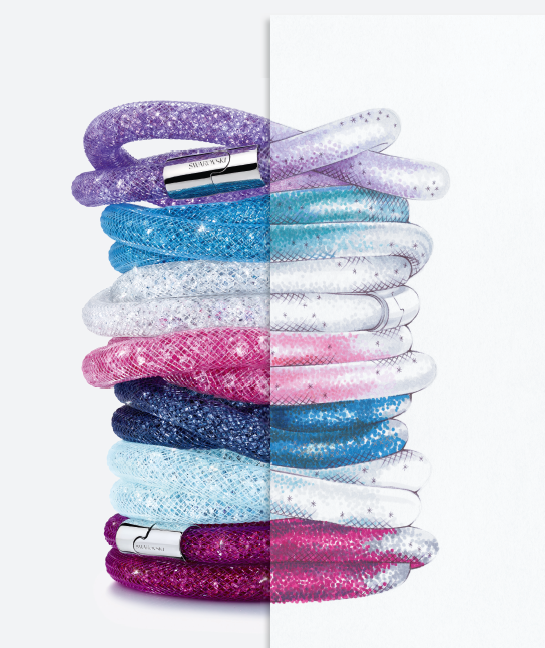El lanzamiento estelar del año pasado, el codiciado brazalete Stardust, sigue siendo protagonista y muestra una interesante evolución. Ahora resplandece en multitud de tonos pastel. Tanto el brazalete sencillo como el doble, que incorporan 730 y 1460 minúsculos cristales respectivamente, están ahora disponibles en versiones de dos tonos y en collar. A partir de esta paleta de delicados tonos pastel, se logra un efecto de degradado realmente atractivo.