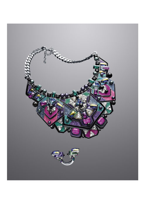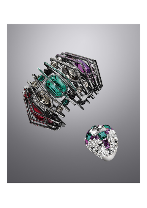 Los cristales en miniatura con incrustaciones en rutenio son el elemento clave de la pulsera Blossom, elaborada para evocar una estructura similar a una caja con cristales en tonos de gris, amatista, rubí y esmeralda. Más fluidos, los pendientes largos a juego cobran vida con brillantes reflejos de cristales móviles, un look que se completa con el anillo Billion gracias a sus generosas y refinadas líneas.