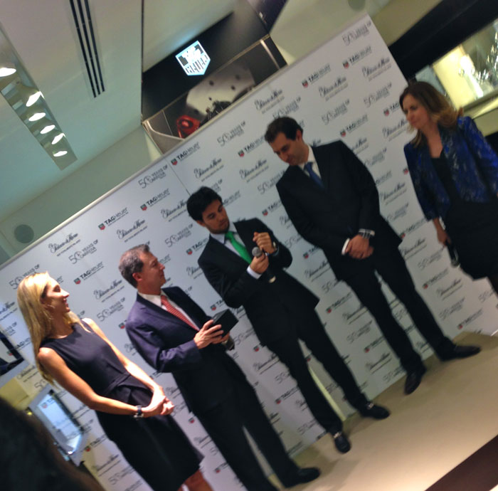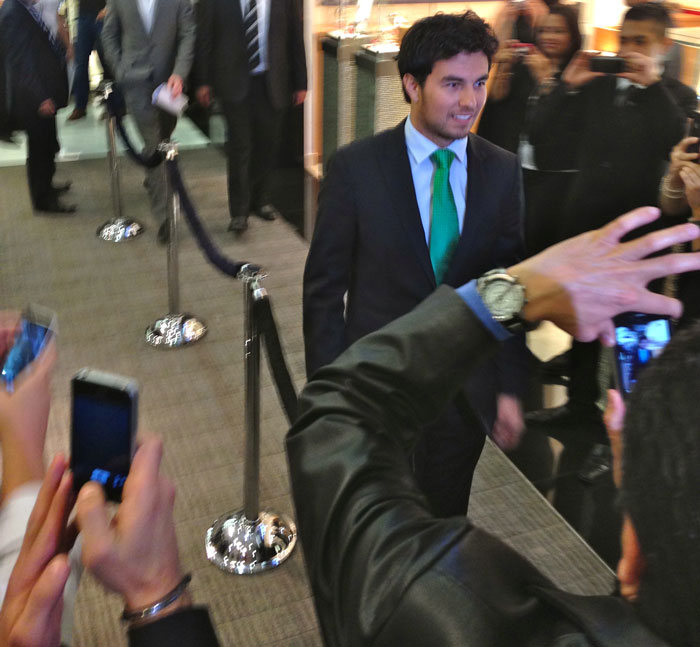 Con motivo de los 50 años del nacimiento del emblemático reloj CARRERA de TAG Heuer, surgida gracias a la inspiración en La Carrera Panamericana en 1963 por Jack Heuer, –esta noche– se realizó un evento de presentación que tuvo como protagonista al piloto tapatío de Fórmula 1 del equipo McLaren: Sergio “Checo” Pérez, quien arribó en punto de las 18:00 a la boutique de la marca ubicada al interior de El Palacio de Hierro de Centro Comercial Interlomas. El llamado corrió a cargo de Gloria Calzada, comunicadora de “impecable trayectoria”, como lo hiciera notar Karim Santiago, Brand Manager de TAG Heuer México.