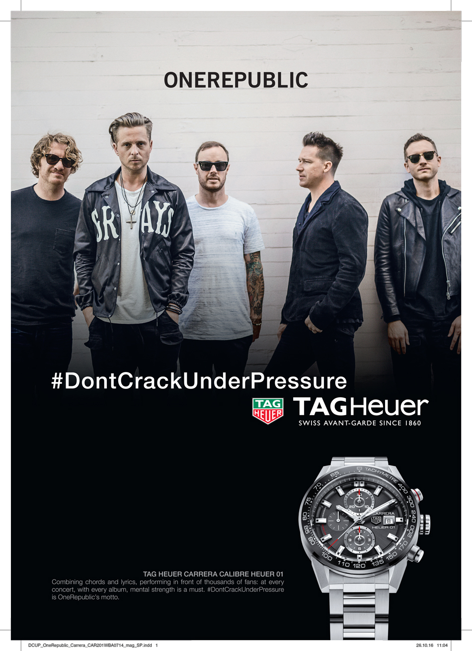 Con motivo del lanzamiento del nuevo disco de la banda estadounidense, Oh My My, TAG Heuer anunció su nueva asociación con OneRepublic y su mundo musical. Ahora los fans del grupo musical podrán conocer a cada uno de los integrantes en un backstage organizado por la Casa Relojera y por supuesto, el lema #DontCrackUnderPressure será recordado en cada concierto.