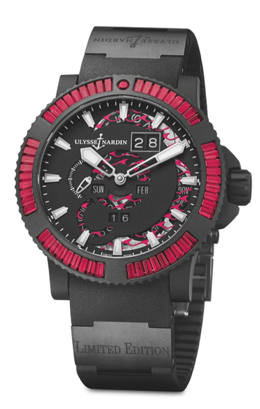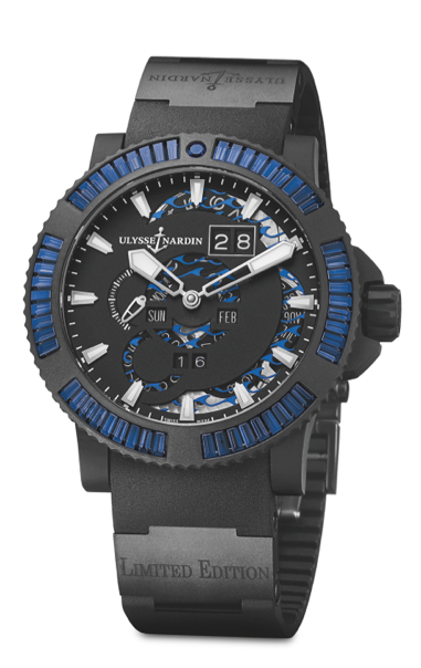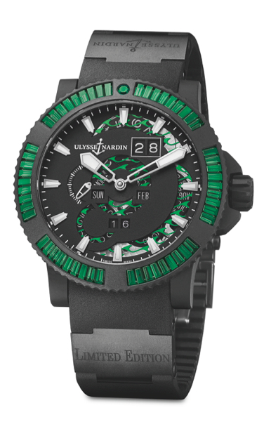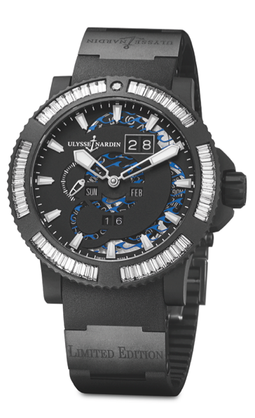 Ulysse Nardin Marine Perpetual: el gran movimiento de la casa con mecanismo de calendario perpetuo presentado en 1996 se presenta en estética Marine Diver y con engaste de diamantes, zafiros teñidos y cerámica ¡Sobre caucho! Una disciplina difícil de ejecutar, tan es así que recibe por nombre: “engaste triple s”. Su manipulación hacia adelante y atrás además entrega una practicidad pionera en la industria.