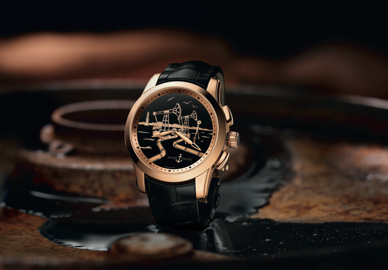 Hour Striker Oil Pump: la nueva configuración de este clásico develado el año pasado en platino ahora se presenta en oro rosa. Su mecanismo hace sonar las horas y entrega una animación autómata de la excavación de posos petroleros, lo cual nos invita a pensar que ha sido una pieza tan bien recibida que se terminó en oro blanco y ahora está dispuesta en este bellísimo color.