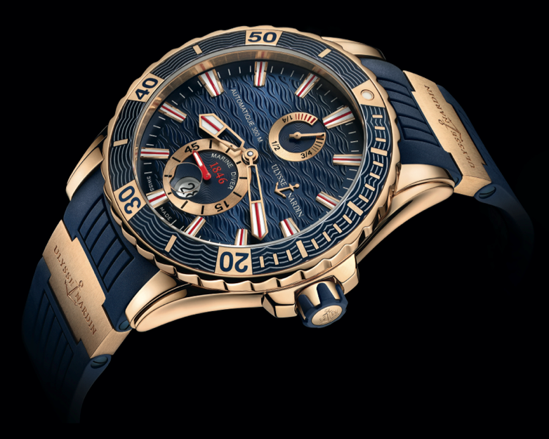 Gold Highlights Marine Diver: relojería marina con personalidad náutica y hermeticidad de hasta 300 metros. En esta configuración se devela con bisel unidireccional de oro rosado y caucho azul, mientras que caja, cuernos, asas, índices y círculos de totalizadores se presumen en este mismo metal precioso. Esta “carrocería” representa el lado ejecutivo del Diver, sin perder su espíritu deportivo.