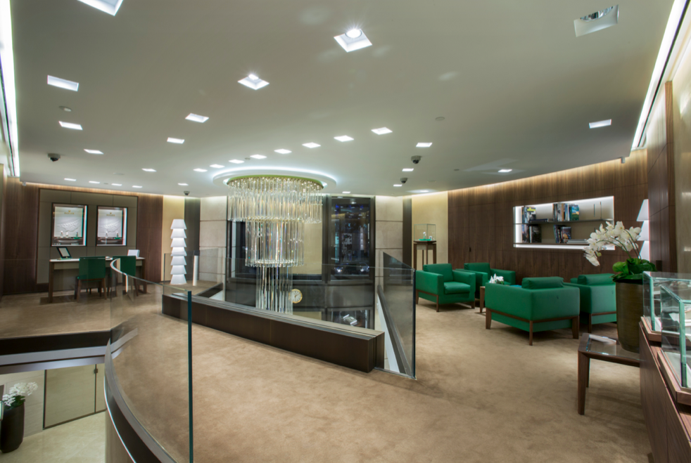 Datos: el espacio de exhibición mide 120 m2, y ha sido diseñada para exhibir cada una de las colecciones de la familia. Al interior, un impresionante candil de la compañía Vitosi –de 2,65 m de alto– fue incluido, su montaje fue posible tras 20 días de trabajo, y su peso es de media tonelada. En la planta baja, justo en la recepción se sitúa un panel de cristal aqua característico de la casa, mientras que las alfombras oscuras, las maderas de nogal y los sillones verdes forman parte de una armonía de marca excepcional.