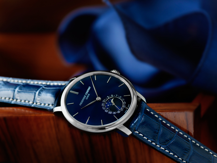 - Slimline Moonphase Manufacture // Referencia: FC-705N4S6 / Calibre: FC-705 de manufactura / Movimiento: mecánico automático / Funciones: horas, minutos; fechador y fases de Luna / Caja: 42 mm de acero inoxidable pulido / Cristal: zafiro convexo y fondo de cristal de zafiro / Corona: a las 3 h ajustable en tres posiciones Carátula: color azul marino con índices en níquel / sub-carátula en posición de las 6 h para la indicación de la fecha y fases de Luna Correa: piel de aligátor color azul marino / Hermeticidad: 30 metros.