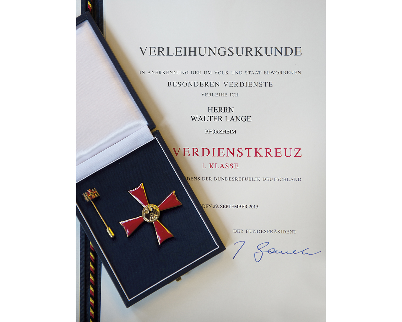 La Orden del Mérito de la República Federal de Alemania es un reconocimiento que se entrega a personas que destaquen por sus logros, ya sea en el área política, económica, cultural, intelectual, entre otras. Este 25 de noviembre, el fundador de Lange Uhren GmbH, Walter Lange, gracias a su labor en restablecer la industria relojera en Sajonia, fue reconocido con esta orden otorgada por el presidente alemán, Joachim Gauck y entregado por Stanislaw Tilich, Ministro-Presidente del Estado Libre de Sajonia en la Cancillería del Estado de Sajonia en Dresden.