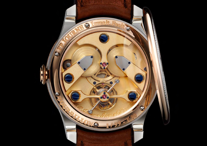 Hoy, F.P. Journe presenta y presume una verdadera obra de arte realizada en caja de plata con patrón guiilloché y dos biseles de oro roso 4N, que recuperan la tradición relojera exhibida hace tres décadas. Uno de los detalles contemporáneos más importantes resulta el fondo realizado en cristal de zafiro, que permite admirar la belleza del torbellino realizado íntegramente por el relojero. Al tratarse de una complicación tradicional, tenemos que decir que éste gira a razón de una vuelta por minuto, conocido entonces como tourbillon de 60 segundos, que gira gracias a un par de barriletes, para la neutralización de los efectos negativos de la fuerza de gravedad en el volante. Finalmente, el movimiento de manufactura presume de acabados biselados y pulidos a puentes y platina, que será destinado únicamente para 99 privilegiados clientes, debido a la limitación de la edición.