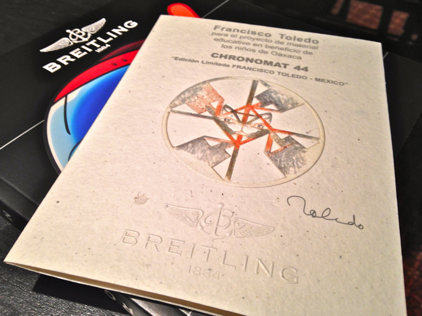 Asimismo, Lorenzo García, Director General de Horologium, presentó a Emilio Watson, Director Comercial de Breitling México con el afán de dar la bienvenida a sus invitados, quienes durante un par de minutos fueron testigos de la presentación del proyecto de material educativo en beneficio de los niños de Oaxaca, ello gracias a la suma recaudada posterior a la subasta de la edición número 1 del reloj y boceto creados por el Maestro Toledo, quien utilizó el lienzo de un Cronomat 44 para su ejecución.