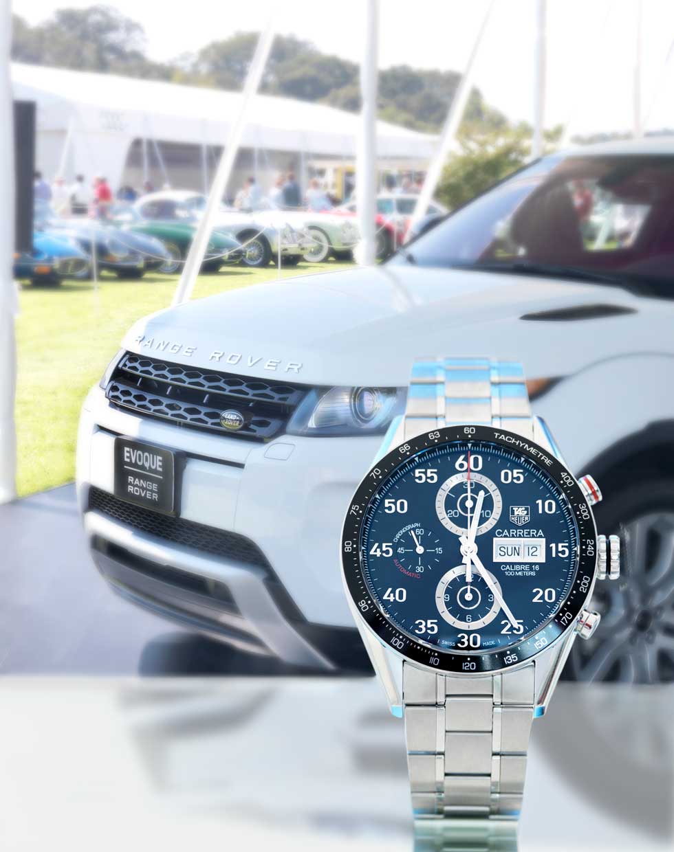 - Carrera Day Date Chronograph Movimiento: automático calibre 16 Frecuencia: 28,800 a/h Funciones: horas, minutos, segundos; día y fecha, escala taquimétrica y cronógrafo Caja: 43 mm de acero / Range Rover Evoque Motor 4L de 240 hp / 250 lb-ft Tracción 4WD / Dirección Electroasistida Aceleración: 0 – 100 km/h : 7.6 seg