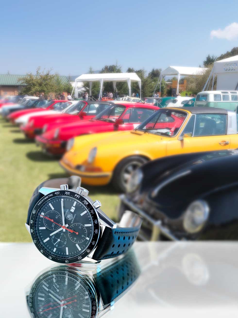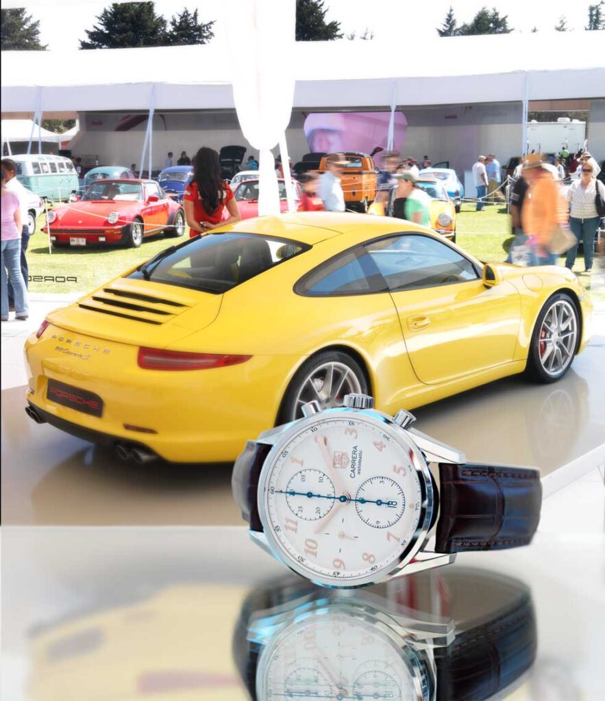 - Carrera Calibre 16 Heritage Chronograph (rose gold) Movimiento: automático Frecuencia: 28,800 a/h Funciones: horas, minutos, segundos; fechador y cronógrafo Caja: 41 mm de acero / Porsche 911 Carrera S Motor V6 de 400 CV / 440 Nm Velocidad máxima: 304 km/h Aceleración: 0 – 100 km/h: 4.5 y 4.3 (Doppelkupplung PDK) seg