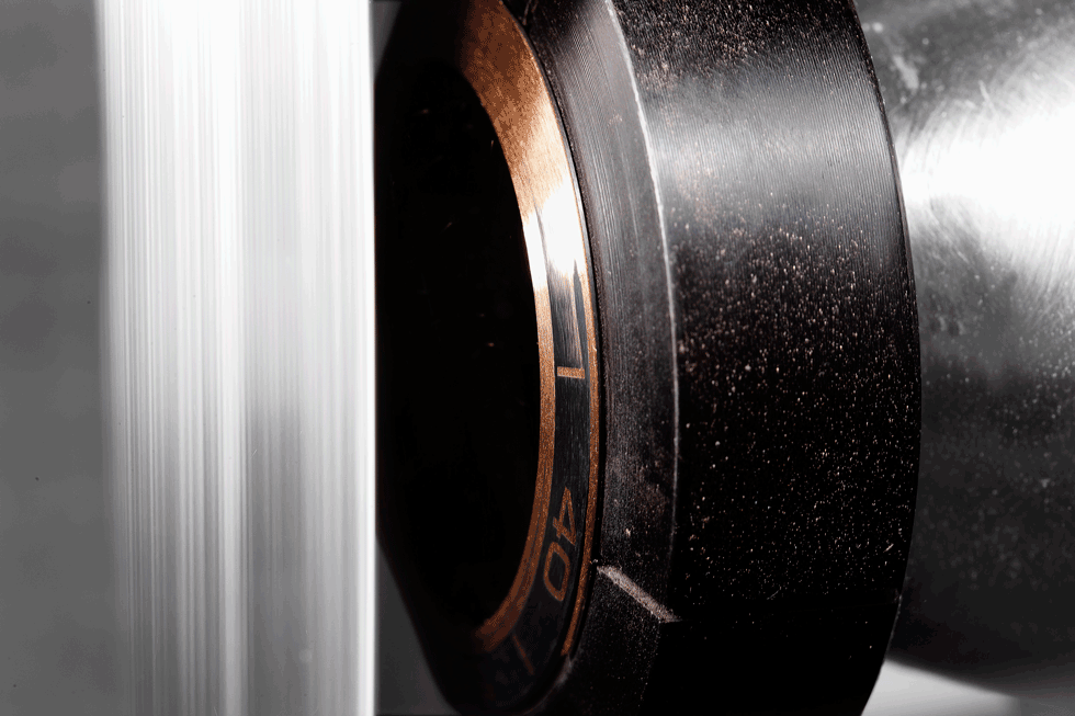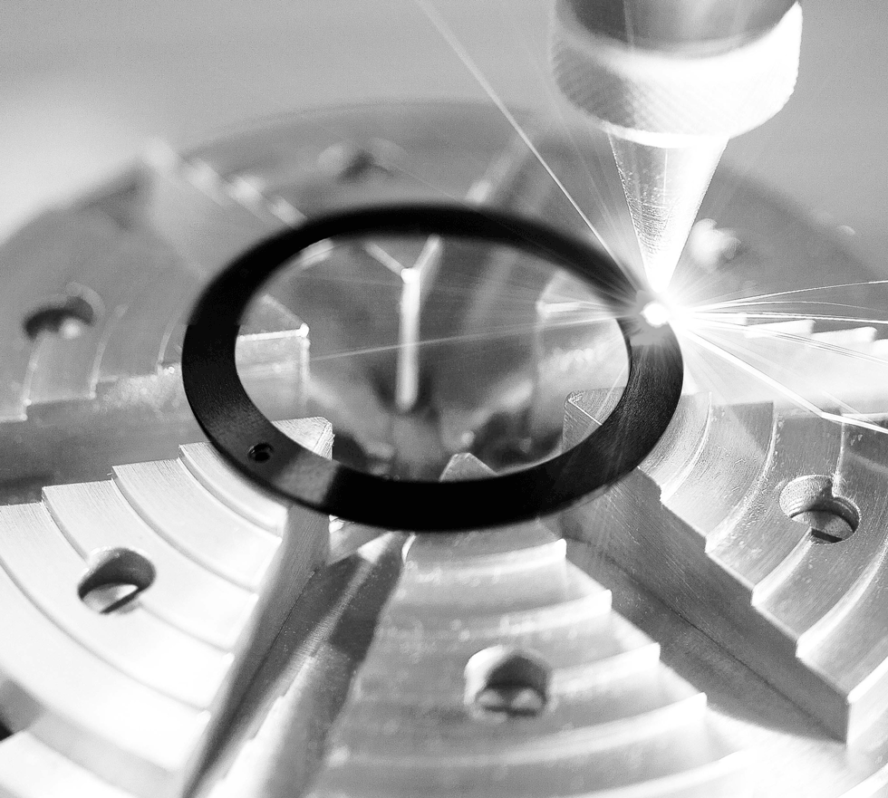 - 3. Grabado de la escala. La escala se graba sobre el bisel utilizando un rayo láser. Eliminando sucesivamente capas finísimas de cerámica, se alcanza una profundidad de 0.15 mm.