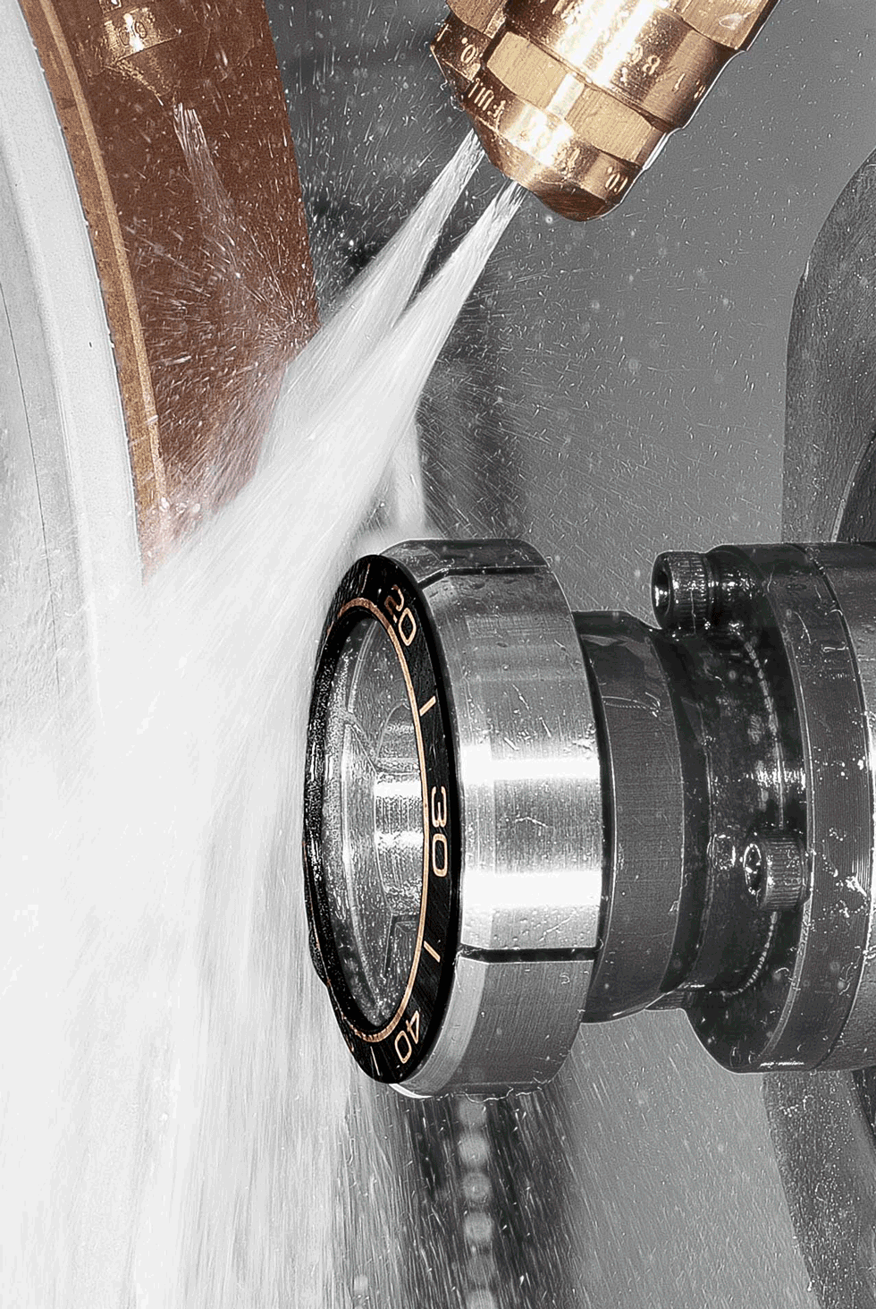El proceso para obtener un bisel de cerámica a base de circonio con números y escala de oro, como el que se aprecia en las piezas que forman parte de la colección Seamaster Planet Ocean CeragoldTM -en la que OMEGA decidió incorporar este innovador material-, es sumamente meticuloso y el efecto es sorprendente.