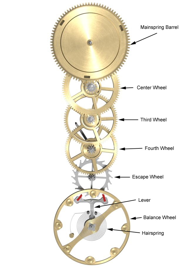 El tren de engranaje, la transmisión, es uno de los cinco elementos básicos para el desarrollo de un reloj. El tren de ruedas cumple la función de guiar la liberación y optimización de la energía y, a manera de revoluciones puede ofrecernos la visión de las: horas, minutos, segundos e incluso brindar información de la fecha en la medida que agregamos elementos.