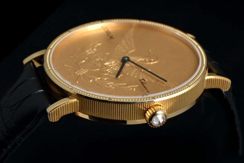 Utilizando la cara de una moneda como carátula y protegiéndola con un cristal de zafiro fue posible crear la colección de relojes Coin Watch. El proceso de elaboración requiere mucha destreza artesanal, ya que la moneda se corta a la mitad por el canto, se ahueca para incorporar un mecanismo ultraplano, y una vez colocado el cristal de zafiro, se enmarca el bisel para dar soporte a la estructura y reproducir las muescas de la moneda.