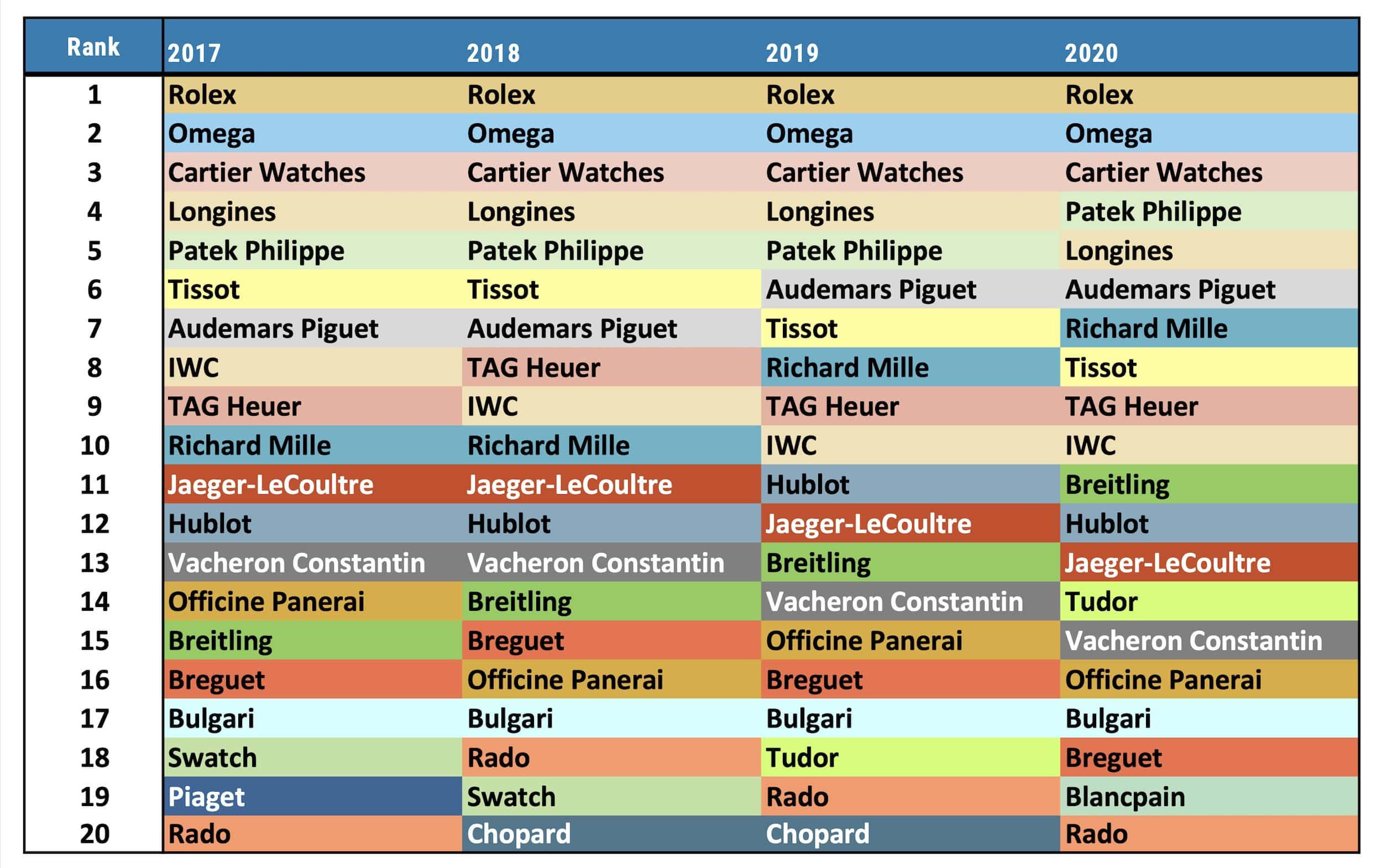 Audemars Piguet y Richard Mille se apropiaron del sexto y séptimo lugar del mercado, al tiempo que Tissot, TAG Heuer e IWC lograron meterse al top 10.