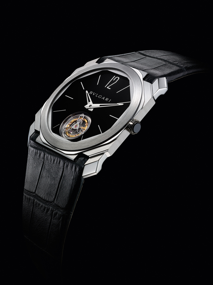 Seleccionamos éste debido a su respeto por los códigos del OCTO, el nuevo icono de Bvlgari que, este año no solamente recibió pulsadores y módulo para cronógrafo, sino que restó gramos al acero para albergar al tourbillon más delgado del planeta: 1.95 mm, incluso más delgado que una moneda de cinco francos. La solución más práctica para poder llegar a dicho récord fue la de utilizar rodamiento de bolas, siete en total para el calibre compuesto por 249 piezas y 55 horas de reserva de marcha, mecánica ligera que se ve ¡¡¡muy bien!!!