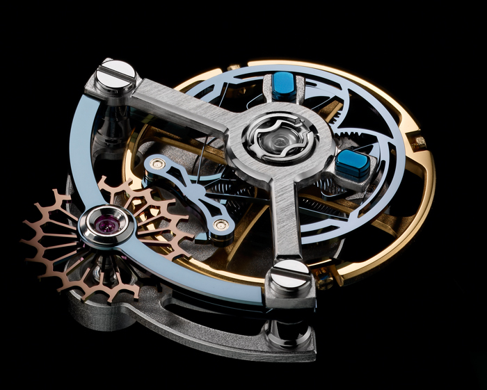 Los aportes a esta complicación tan importante han despegado, sí, todos somos amantes de los tourbillones, pero pocos dominan su fabricación y muy pocos logran mejorarlo, ya sea en velocidad de rotación o en ángulos de compensación, el torbellino nuevamente ha sido elevado, en esta ocasión al cubo, pues rota sobre tres diferentes ejes: la jaula alberga un tourbillon tradicional (60 segundos), mientras que ésta se integra a una estructura de segundo eje que la hace completar una vuelta cada 30 segundos, mientras que ambas se acoplan a un tercer eje que ejecuta la rotación en dos minutos, el órgano regulador palpita a una frecuencia de 3 Hz.