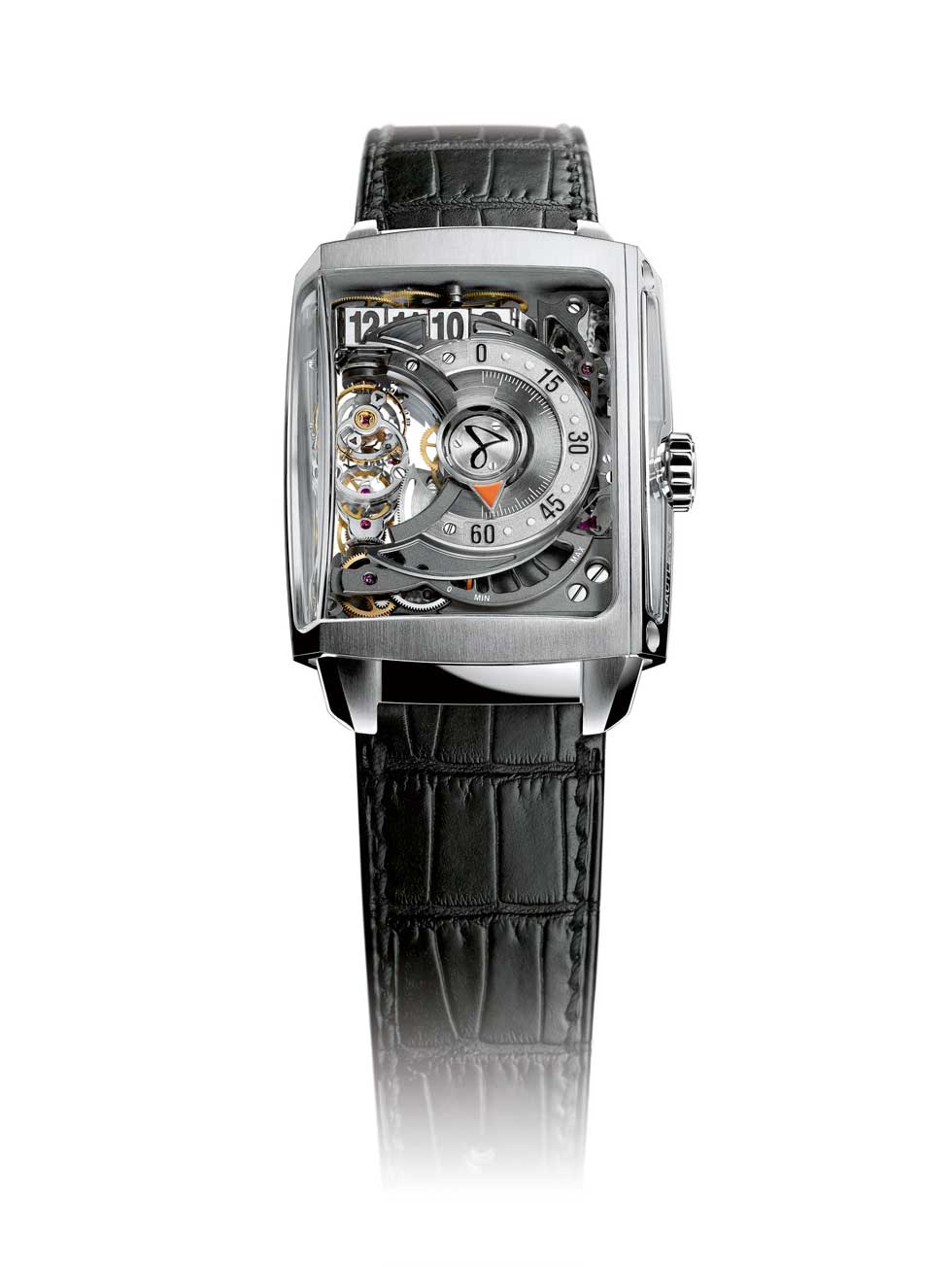 - Harry Winston Opus 12 Funciones: horas y minutos. Una aguja retrógrada sincronizada con la aguja principal de los minutos avanza a lo largo de un sector de cinco minutos. Al final del recorrido, vuela hacia atrás y se coloca en la posición inicial. La aguja larga de cinco minutos pivota y vuelve a su sitio Sueño de Emmanuel Bouchet