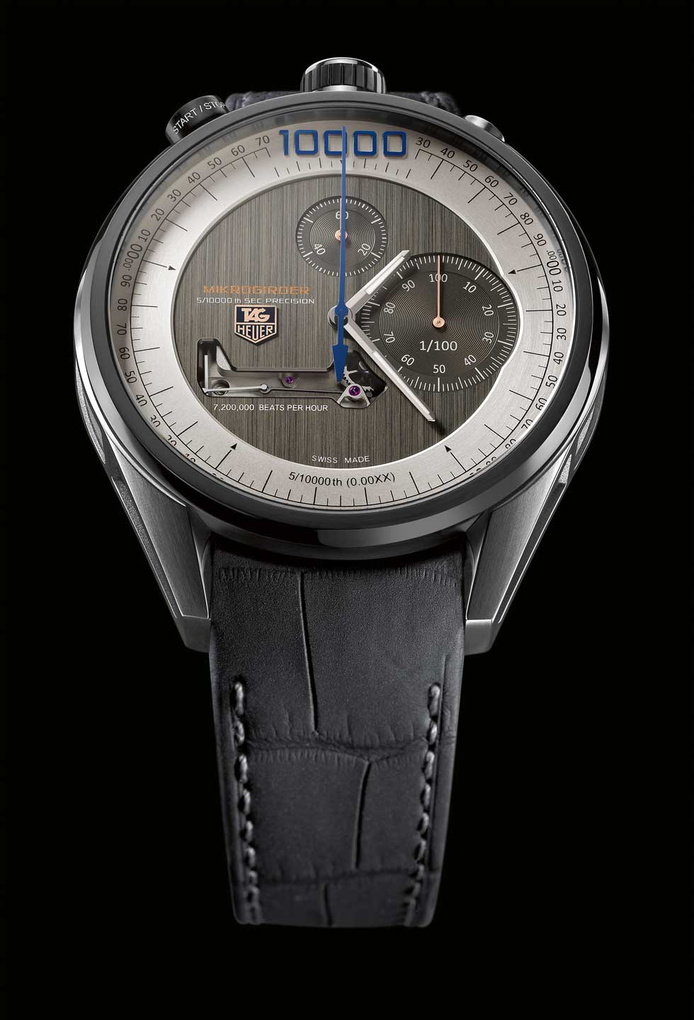 - TAG Heuer Mikrogirder Funciones: horas, minutos y segundos; cronógrafo a frecuencia de 1,000 Hz, medición de 1/2000 de segundo. Sueño de Guy Sémon.