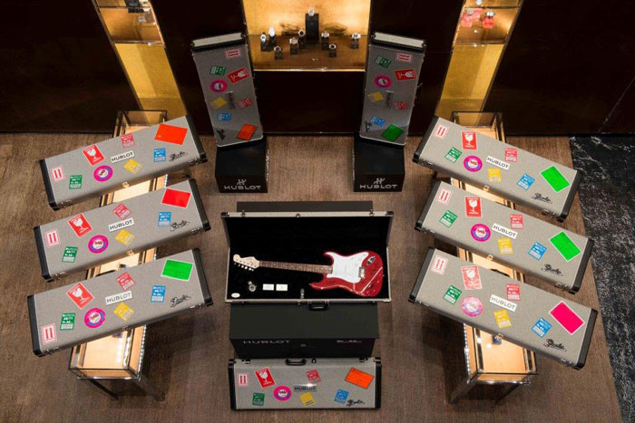 Así de sencillo, HUBLOT echa mano de todos sus recursos e imaginación creativa para continuar con la asociación sostenida con el importante y legendario grupo musical Depeche Mode, que este año ha colaborado nuevamente con la casa relojera con sede en Nyon, para el lanzamiento de: 10 cajas de guitarra que albergan al interior (cada una)– una guitarra firmada por los elementos de la banda y una pieza de edición especial que lleva por nombre Hublot Big Bang Depeche Mode 2014, cuya particularidad es que la aguja roja de la trotadora lleva grabado el nombre de una de las 10 ciudades más representativas para el conjunto inglés, es decir: Los Ángeles, Milán, Varsovia, Moscú, Zúrich, Berlín, Hamburgo, París, Nueva York y Basildon, ésta última por ser la ciudad que vio nacer a “Depeche”.