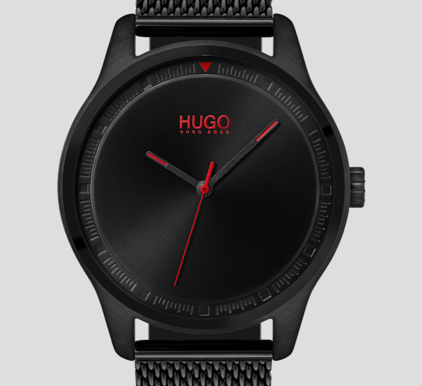 La colección Hugo Watches Move, refleja la personalidad de un hombre masculino a través de su diseño minimalista que resalta por incorporar el color negro en todo el reloj. Con pequeños detalles en rojo, la carátula posee manecillas de hora y minutos tipo esqueleto, mientras que el logo de Hugo se aprecia en punto de las 12 horas.