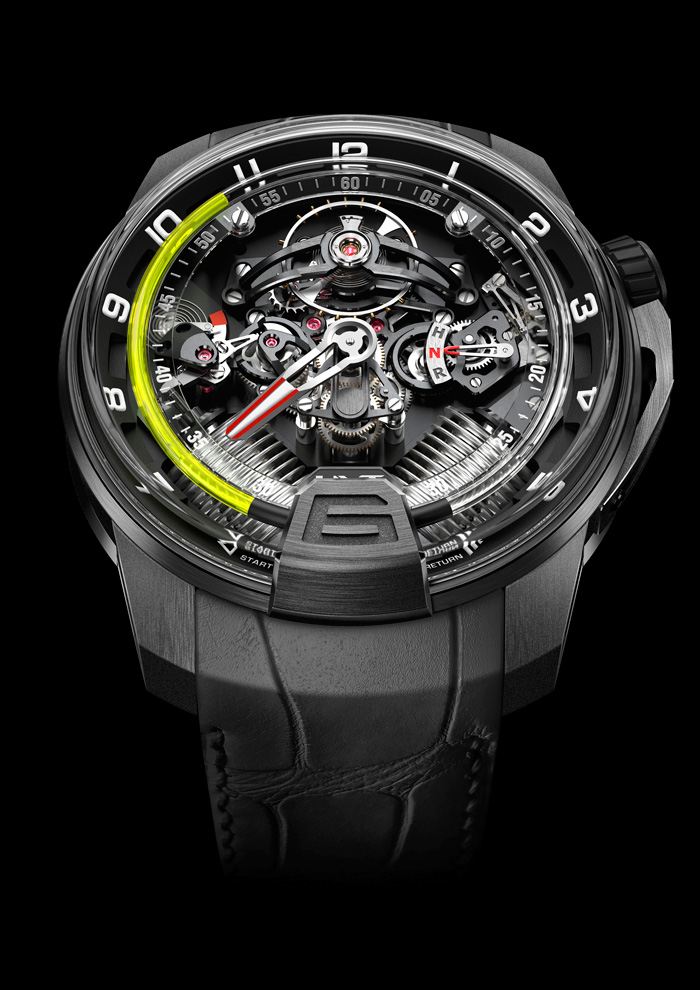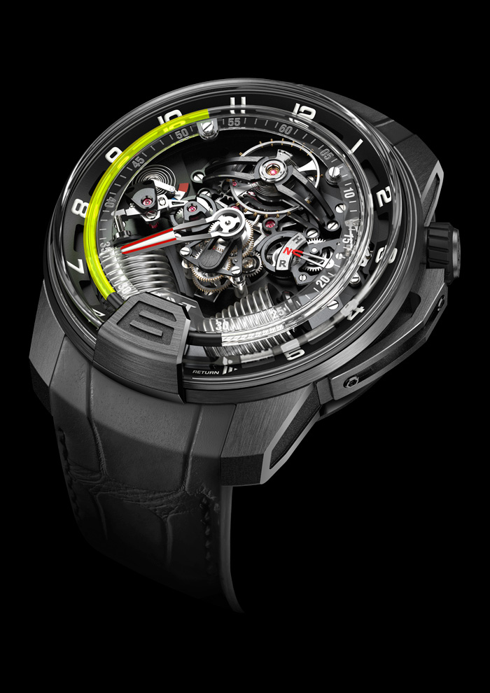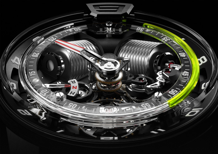 VP: Es impresionantemente complicado poder realizarlo, mucho más complejo que un repetidor de minutos o un tourbillon, es ligar a la química y sus factores con mecánica, y como sabrás en cuestiones químicas hace falta llevar experimentos para saber cómo van a reaccionar los fluidos en este caso. El truco reside en la interface, en cómo vas a transformar la energía del movimiento en aceleración y presión requeridas para las indicaciones del tiempo, horas y minutos, e igualmente en el sistema retrógrado presente en el H1 y H2.