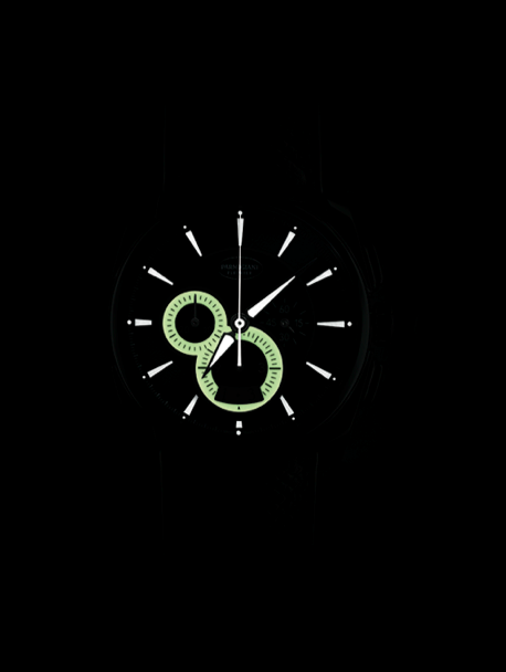Dotada de tratamiento luminiscente para la periferia de los contadores del cronógrafo. La carátula en color verde menta pálido, recibe un tratamiento flinqué para el reloj y un acabado mate para el cronógrafo, lo que destaca la estética de la pieza.