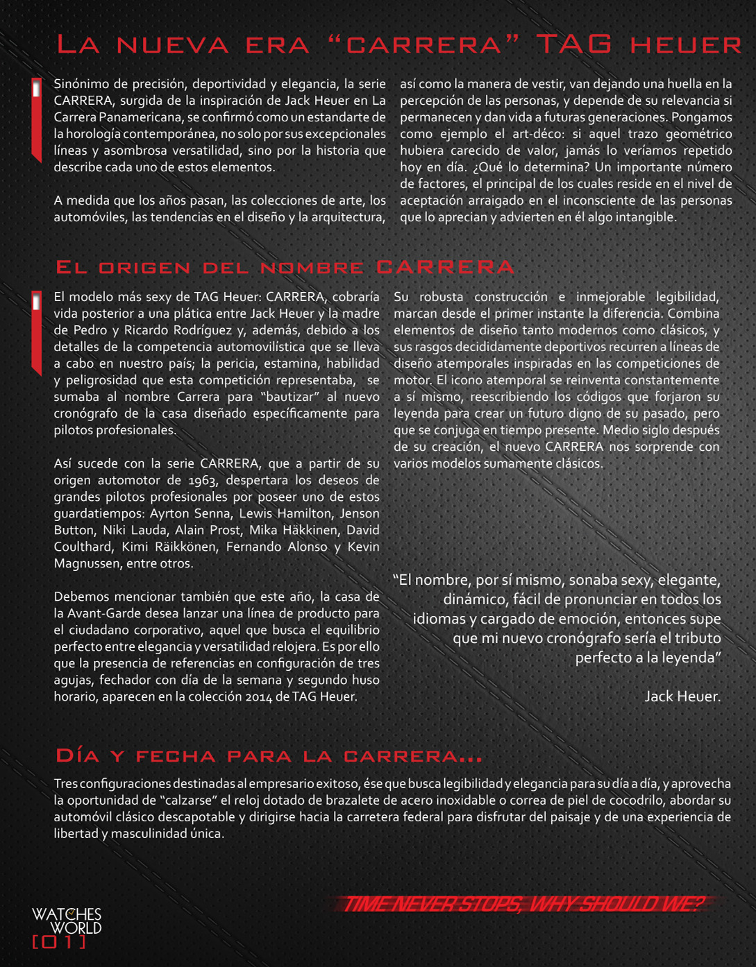 Hemos completado una espectacular trilogía dedicada a TAG Heuer y las piezas relojeras que la han colocado como una de las Manufacturas más reconocidas y respetadas de la industria. En esta ocasión compartimos con ustedes los detalles de la serie Carrera, surgida de la inspiración de Jack Heuer en La Carrera Panamericana.