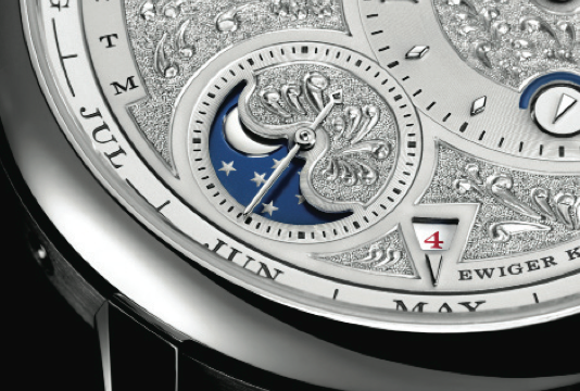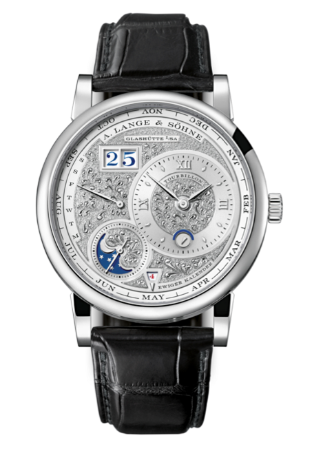 La tendencia a labrar la relojería tiene un nuevo expositor, se trata de una de las piezas más aclamadas de la casa relojera sajona, pues incorpora un movimiento de carga manual Calibre L082.1, que anima a un mecanismo tourbillon y al siempre complejo calendario perpetuo, pero ahora exhibe un amplio dominio del grabado tremblage a mano tanto en su carátula –de oro blanco– como en la masa oscilante fabricada en oro puro de 18 quilates, no obstante el material precioso de su caja, de platino. Edición Limitada a 15 piezas.