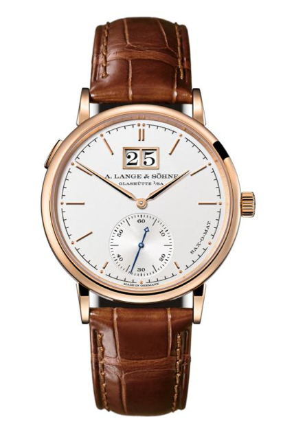 Animado por el legendario movimiento de Sajonia Calibre Sax -o- Mat, la exclusiva Edición Limitada a 25 piezas, exhibe las horas y minutos por agujas centrales de oro, mientras un segundero a las 6 h se encuentra indicado por una pequeña manecilla de acero azulado. Su carátula –de plata maciza–, permite una perfecta visualización de la información más importante, además de privilegiar el día del mes en el que se vive gracias a sus grandes aperturas en posición de las 12 horas. Esta pieza acarrea los valores de la herencia sajona hasta la actualidad, su diseño refleja la elegancia que caracteriza a la familia de A. Lange & Söhne.