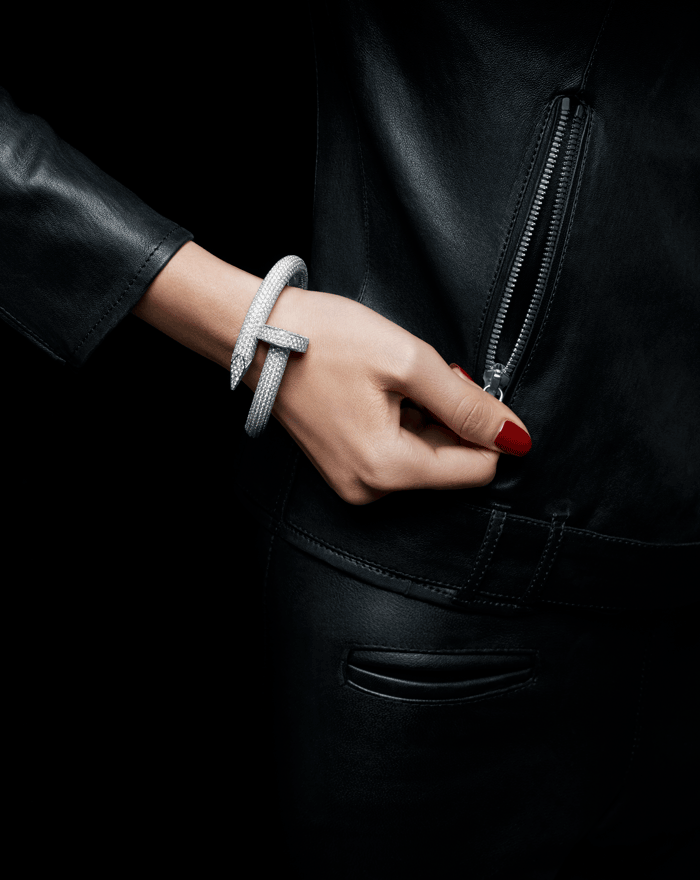 De la colección de brazaletes y anillos Juste un Clou de Cartier sin duda uno de los más bellos integrantes es el brazalete engastado en diamantes. Una joya esencial, diseñada en los años setenta, en pleno auge creativo neoyorquino. La peculiaridad de esta colección es que dibuja los contornos de un estilo moderno y audaz. Esta pieza es una verdadera declaración de audacia y libertad reforzada por el estilo y elegancia que le dan los diamantes.