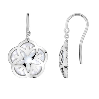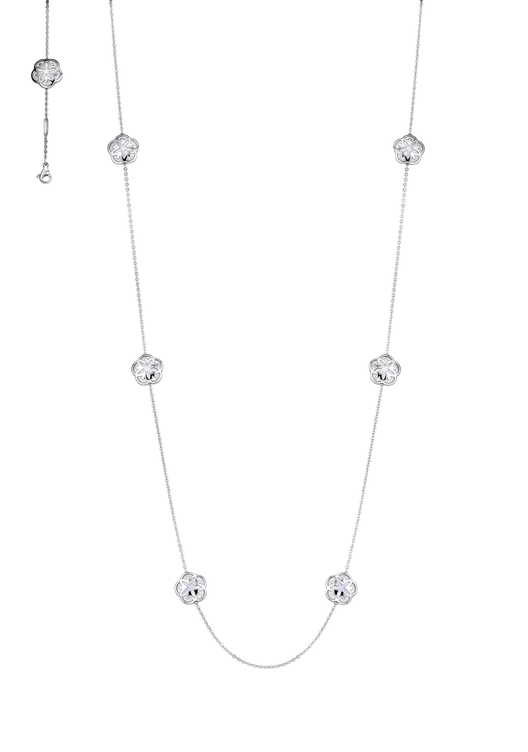 La colección de joyas Flower luce en su diseño el símbolo de OMEGA discretamente entrelazado con una flor. Es una expresión perfecta de feminidad con un toque de glamour. El collar y los pendientes se ofrecen en oro blanco de 18 quilates con nácar.