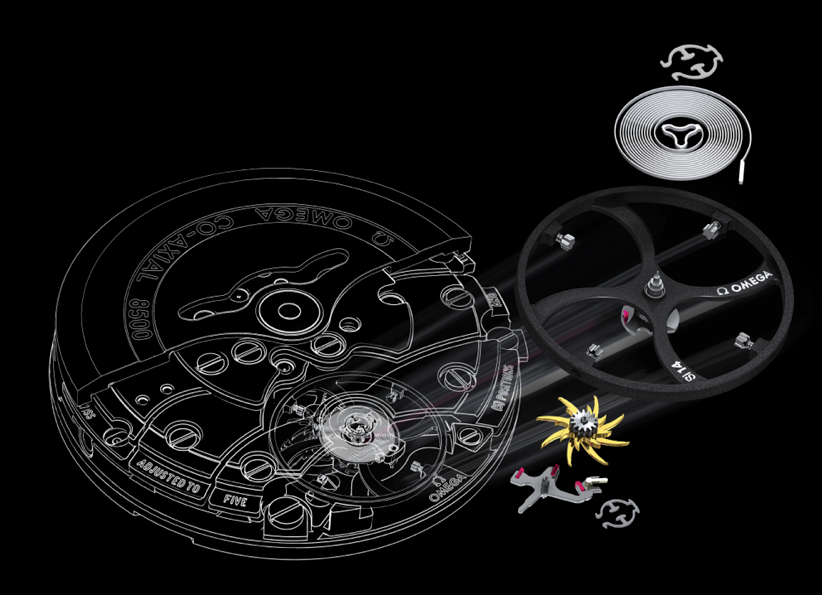 Pero no todos los problemas de la precisión relojera se remiten a este tema, y es por ello que los Master Co-Axial se equipan con un sistema de escape de tres niveles y un conjunto de volante-espiral de oscilación libre exclusivo de OMEGA. Adicionalmente, la estética de éste se ve favorecida, ya que la carga se ejerce gracias a un rotor y a su puente rodiados y decorados con motivo Côtes de Genève.