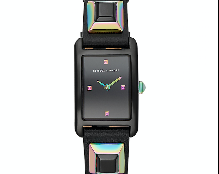 Ideales para ser ajustados por una mujer amante del buen vestir y de añadir toques originales a su outfit, los relojes de la colección Moment de Rebecca Minkoff se ajustarán al pulso de su poseedora a través de un brazalete de cuero con estoperoles negro y destellos de tornasol.