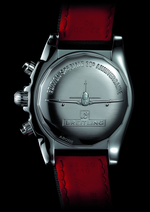 Este Chronomat Airborne se caracteriza por su bisel giratorio satinado provisto de cuatro índices móviles en relieve que permiten descontar los tiempos de vuelo, al tiempo que facilitan la rotación incluso con guantes. Un estilo potente, técnico y elegante. La caja robusta de acero con acabados pulidos está disponible en dos tamaños: 41 y 44 mm. La carátula se propone en dos versiones: negra con contadores plateados, plateada con contadores negros. En el dorso de la caja aparece grabada la inscripción «Edition Spéciale 30 Anniversaire» (Edición Especial 30 Aniversario) así como la silueta de un Aermacchi, uno de los 10 aviones de la patrulla italiana.