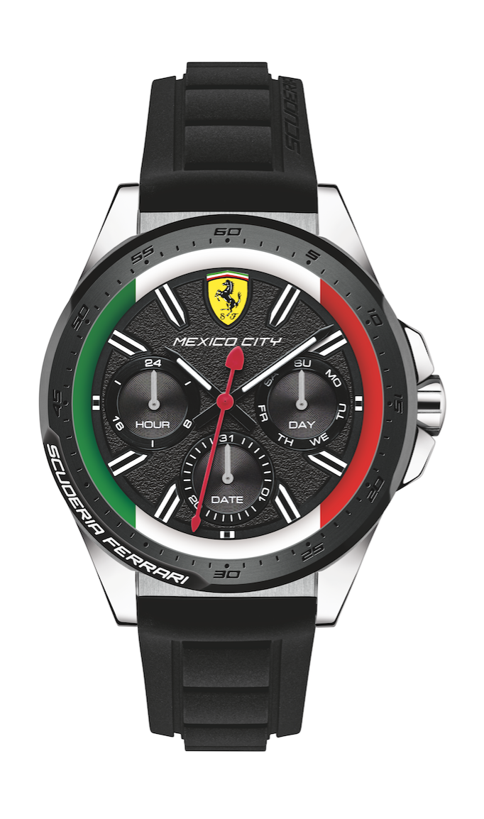 Pilota Mexico City F1 Grand Prix de Scuderia Ferrari, es el nuevo integrante de la firma relojera que fue creado especialmente para homenajear a México por ser parte de la Fórmula 1. Con este modelo, la puntualidad y la velocidad se unen para ajustarse a la muñeca de los pilotos más aguerridos y d los seguidores más fieles de este evento.