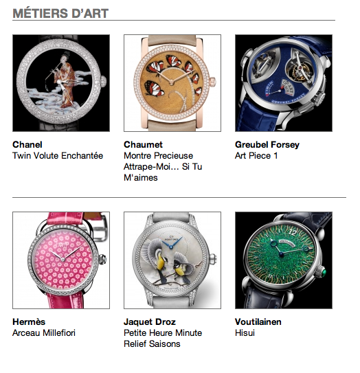 Doce son las categorías a evaluar y, adicionalmente se entregan el “Public Prize” y “L´Aiguille d´Or” al reloj del año por selección de la gente y votantes, y gracias a un jurado por demás calificado: Reloj para Dama, Complicación para Dama, Reloj para Hombre, Mejor Cronógrafo, Mejor Tourbillon, Mejor Calendario, Mejor Complicación de Sonería, Pieza de Excepción Mecánica, la Petite Aiguille, Mejor Reloj Deportivo, Mejor Reloj Joya y Mejor Reloj al Oficio Relojero “Métiers d´Art”, todo esto para la edición número 14 del GPHG.